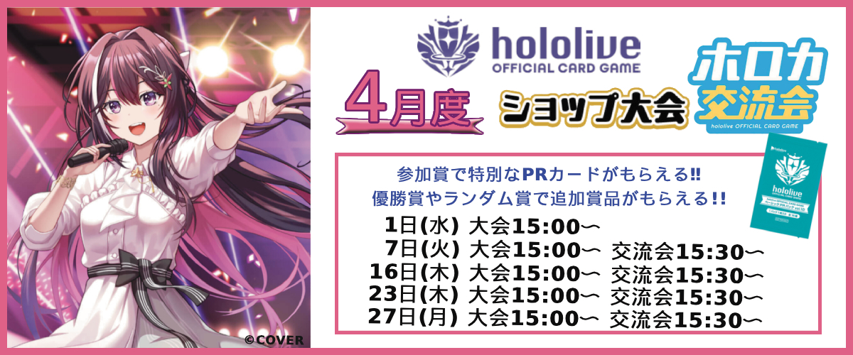 - 2025.06.19 本日開催カードゲーム大会情報!今日は15:00~hololive OFFICIAL CARD GAMEショップ大会が、16:30~交流会が開催となります。大人気ホロライブのカードゲーム大会をお見逃しなく。